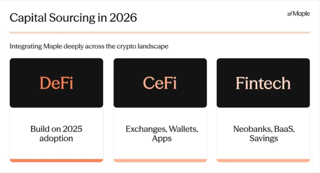A major focus for 2026 as fintech platforms like Robinhood and Revolut expand their crypto offerings. Maple aims to sign three fintech partnerships by quarter end, targeting $500M to $1B in new capital from fintech deals by year end.